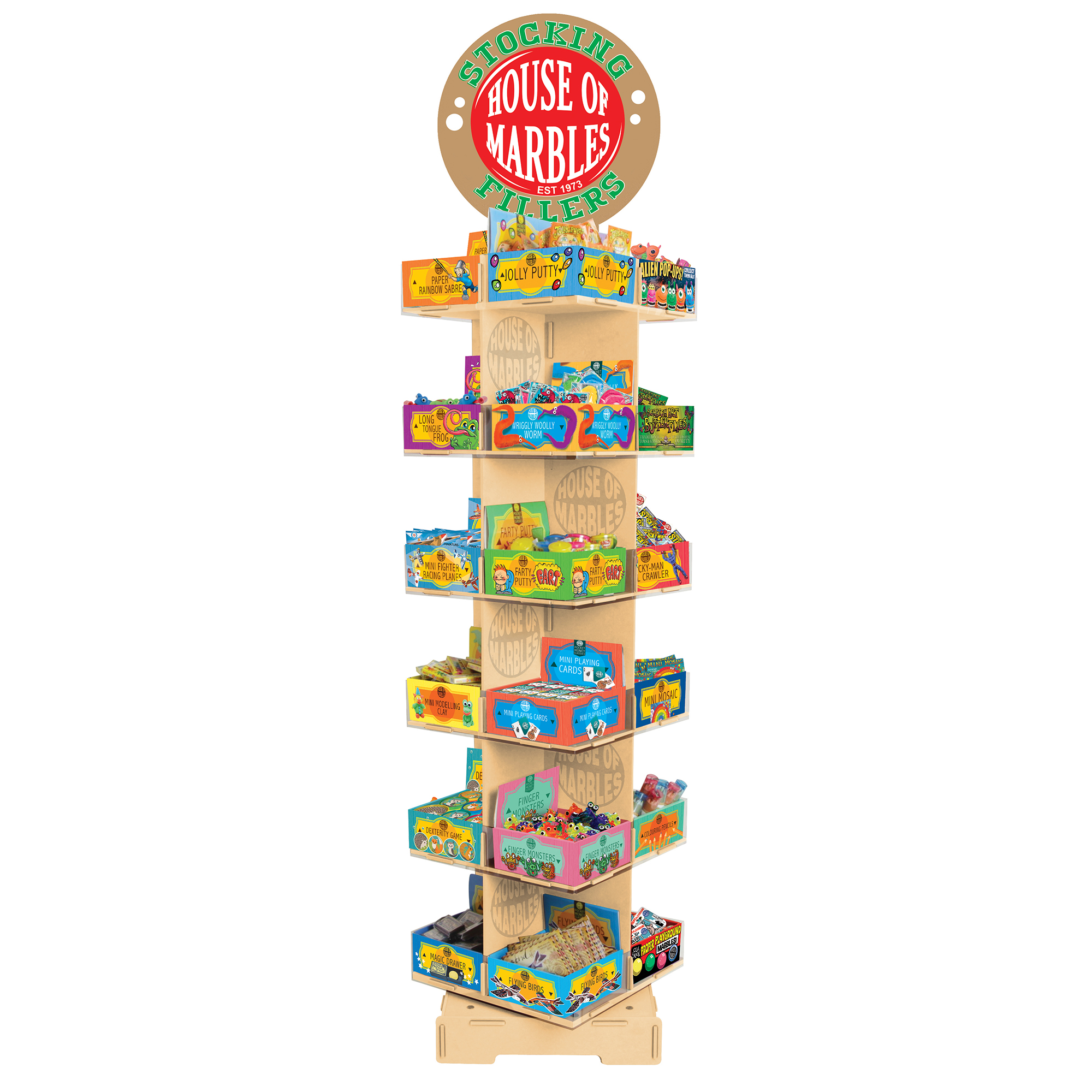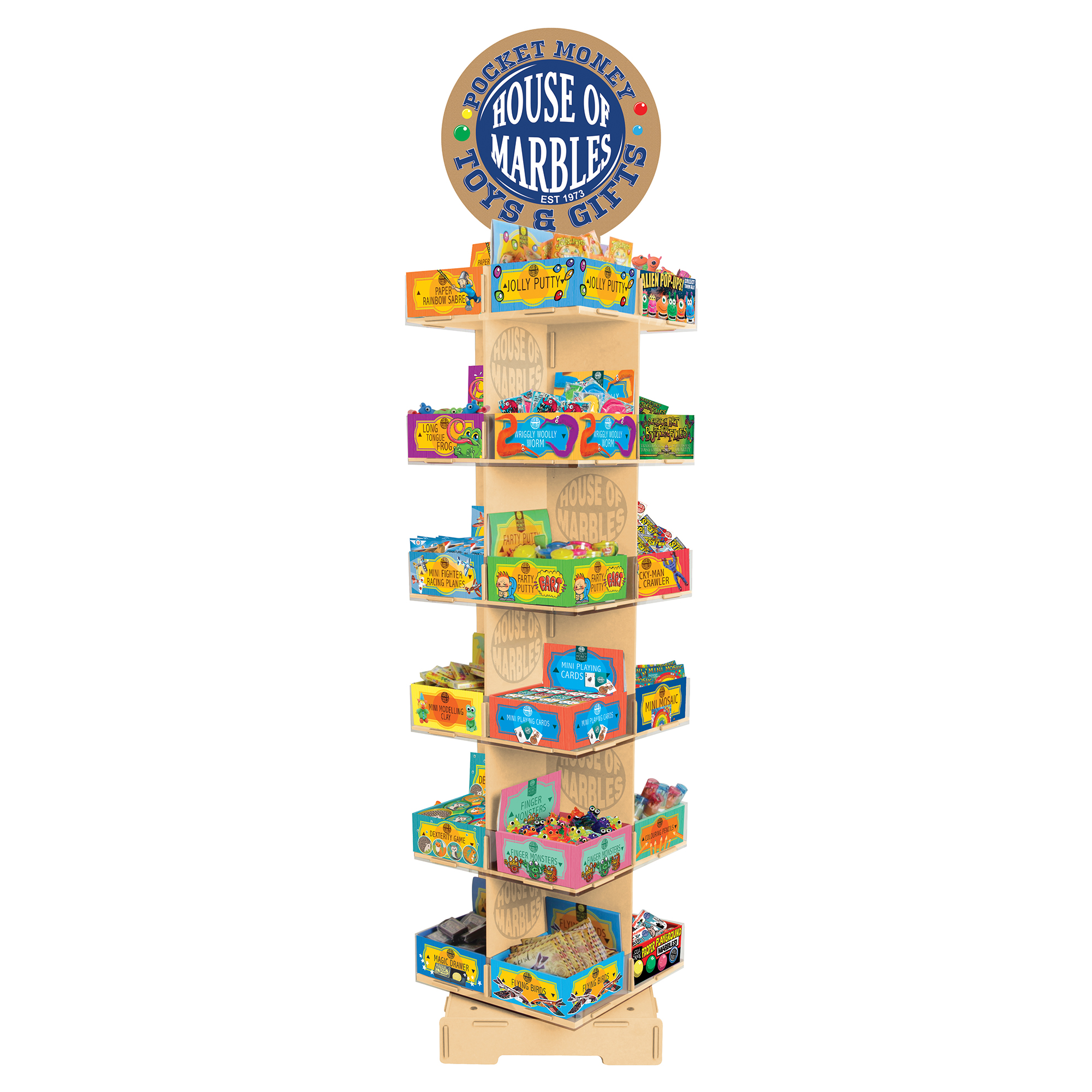 Maximisez l’impact de votre collection House of Marbles avec notre présentoir fonctionnel de haute qualité. La fonction rotative permet d’accueillir non seulement une colonne de 6 présentoirs de comptoir, mais bien quatre fois plus, soit 24. Cela offre la possibilité de vendre quatre fois plus dans le même espace de vente.